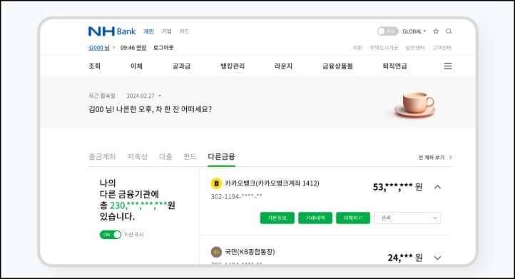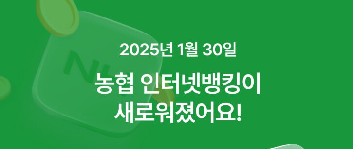 25년 1월 30일부터 농협 인터넷뱅킹 홈페이지가 좀 더 직관적인 인터페이스로 개편되었다. 저축성, 대출, 펀드, 다른 금융 등 모든 계좌를 메인 화면에서 편리하게 관리할수 있게 되었다.