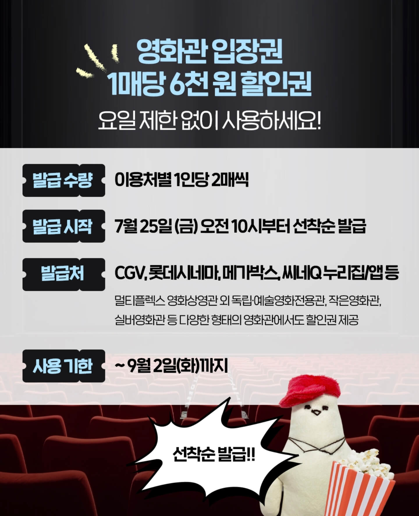 메가박스 영화 할인권은 2025년 7월 25일(금) 오전 10시부터 공식 홈페이지와 전용 앱에서 다운로드를 할수 있고, 한 사람당 최대 2매까지 발급이 가능하며 회차나 요일 제한 없이 사용이 가능하다. 특히 주말 저녁이나 인기 시간대에도 사용이 가능하다는 점은 예전에 진행했던 할인 행사보다 훨씬 유연해진 것 같다. 아침 일찍 봐야 하는 조조나 저녁 늦게 봐야 하는 심야 타임을 피하지 않아도 되기 때문에 실질적인 할인 체감도가 높다는 것이 가장 큰 장점이지 않을까 싶다.