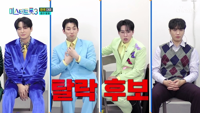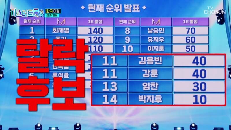 그렇게 모든 무대가 끝나고 미스터 트롯3 순위가 발표되었으며 점수를 적게 받아 공동 11위, 13위, 14위에 오른 김용빈, 강훈, 임찬, 박지후가 탈락후보가 되었다.