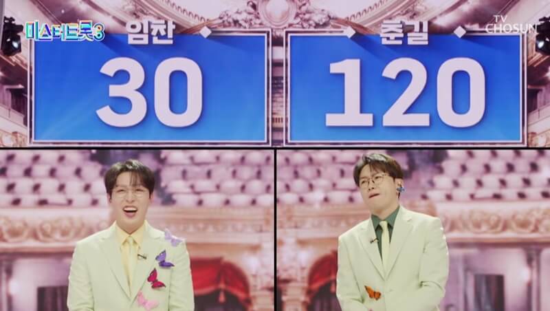 두 번째 무대에서는 임찬과 춘길이 현철의 사랑은 나비인가 봐를 선곡해 완벽한 호흡을 자랑하면서 우열을 가릴 수 없는 무대를 선보였다. 임찬은 1대 1 데스매치 때도 천록담을 지목했다가 패하더니 이번에도 우승후보인 춘길을 선택하였고, 결국 120점을 받은 춘길에게 압도적인 표차로 패하고 말았다.