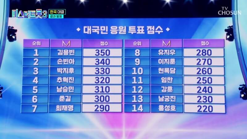 하지만!! 미스터 트롯3 14명의 순위는 여기서 끝이 아니었다. 바로 매일 진행된 대국민 응원 투표 점수가 남아있었던 것!!!