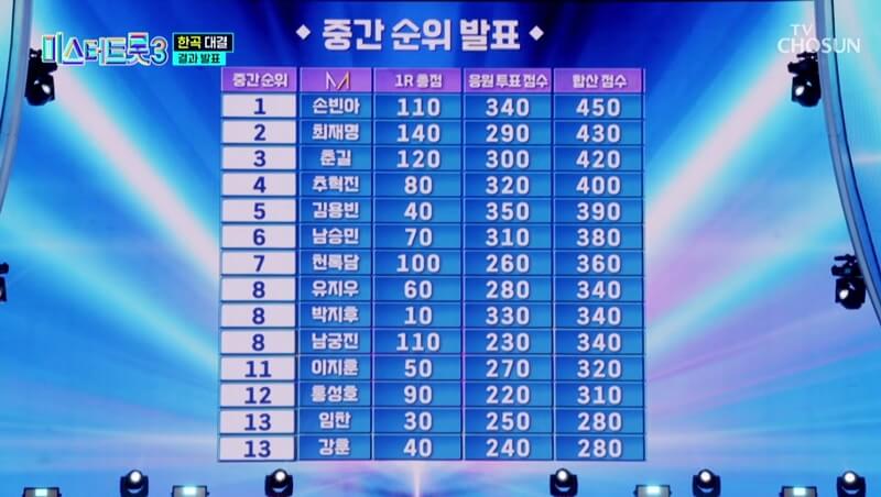 그렇게 응원투표 점수로 인해 미스터 트롯3 순위가 요동치면서 이지훈, 홍성호, 임찬, 강훈이 탈락후보가 되고 말았다.