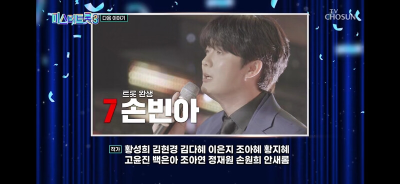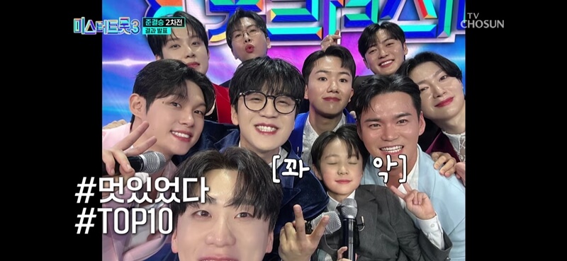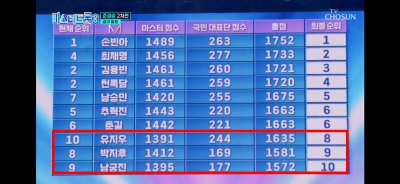 우선 본론으로 들어가 미스터 트롯3 탈락자명단을 말해보자면 준결승 2차전무대까지 모두 끝난후 최종 순위에서 8,9,10위를 차지한 유지우, 박지후, 남궁진이 탈락하게 되었고, 손빈아, 최재명, 김용빈, 천록담, 남승민, 추혁진, 춘길은 결승전에 올라갈 TOP7이 되었다.