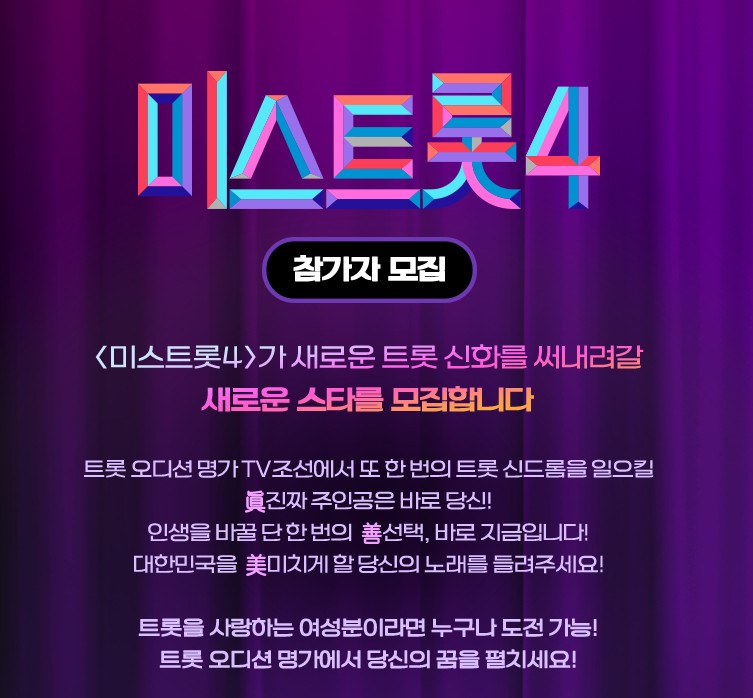트롯에 대한 열정만 있다면 나이와 경력 제한없이 누구나 도전할 수 있다. tv조선 공식 홈페이지에 접속해 미스트롯4 참가자 지원 안내를 찾아 지원서 작성 및 영상 심사 준비를 지금 바로 시작해 보자.