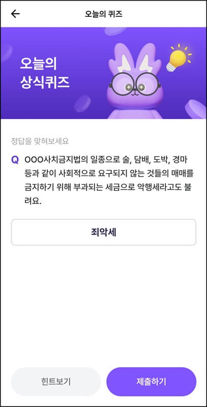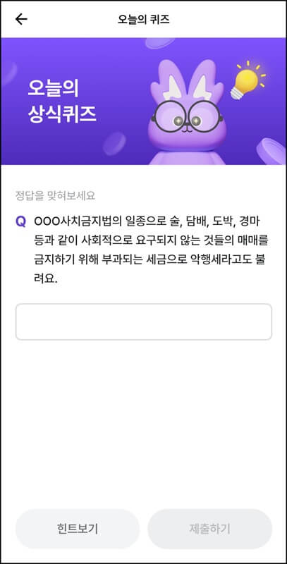 7월 1일 비트버니 오늘의 퀴즈는 사회 상식 문제로 제출되었는데 000사치금지법의 일종으로 술, 담배, 도+박, 경+마 등과 같이 사회적으로 요구되지 않은 것들의 매매를 금지하기 위해 부과하는 세금으로 악행세라고도 불린다는 문제가 출제되었다. 여기서 000에 들어가는 단어를 맞히면 되는데 힌트보기를 누르니 자음으로 ㅈㅇㅅ가 제공되었다.