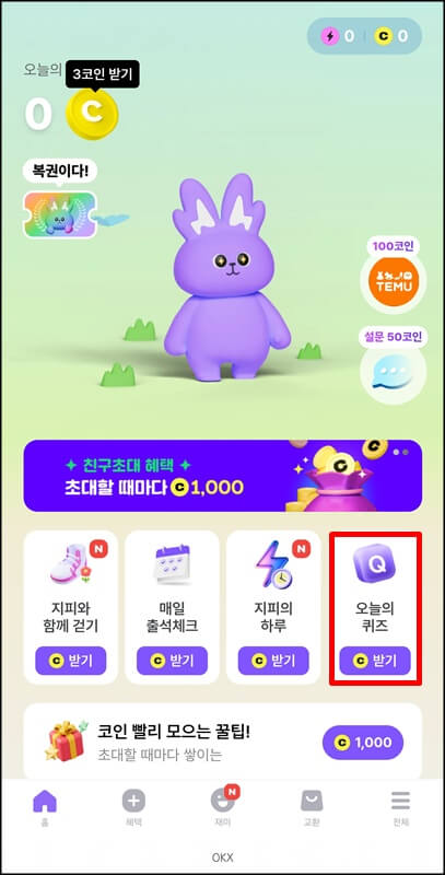 참여시간은 매일 0시부터 밤 11시 59분까지이고, 정답 기회는 하루에 1번뿐이며 정답시 외대 100 코인을 적립받을 수 있다. 그리고 차곡차곡 적립한 코인은 앱에 있는 교환소에서 다양한 리워드로 교환이 가능하다.