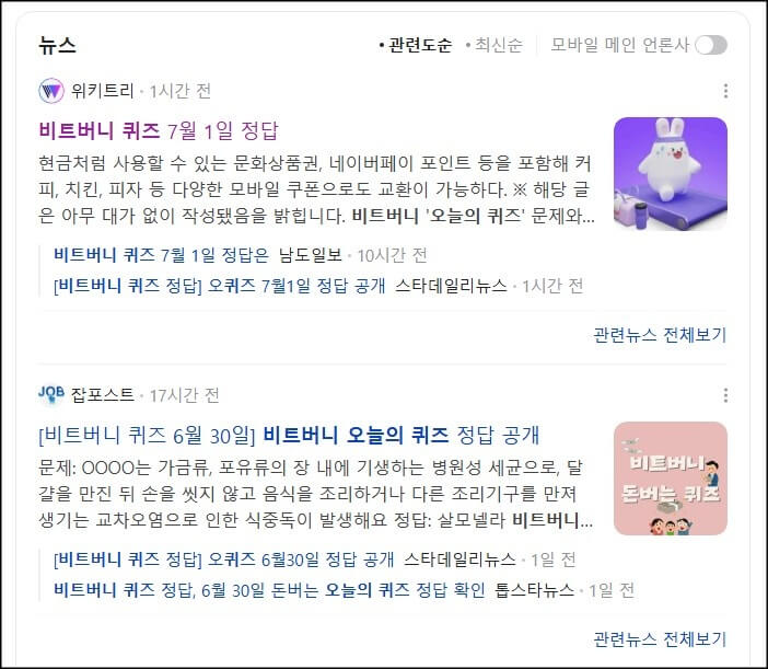 사실 비트버니 오늘의 퀴즈는 간단한 상식 문제 위주라서 크게 어렵지는 않지만 자음 초성 퀴즈 형식이다보니 처음 참여하는 분들은 조금 헷갈릴수가 있다. 그럴때는 네이버 검색창에 비트버니 퀴즈 정답을 검색하여 뉴스 기사로 올라온 퀴즈 정답을 확인하고 문제를 풀면 쉽게 정답을 맞힐 수 있다.