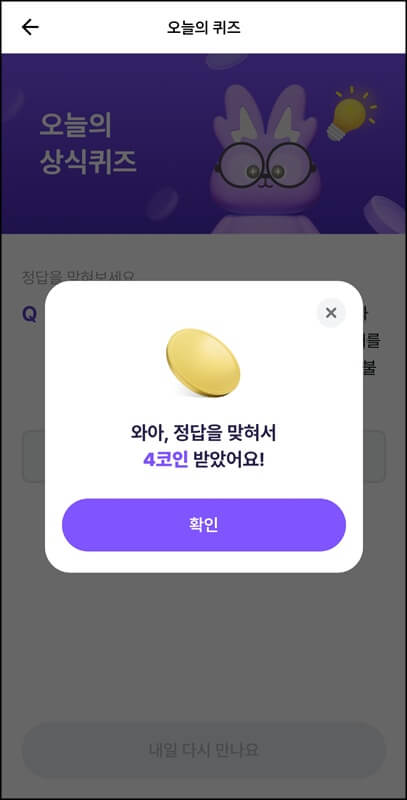 그렇게 비트버니 오늘의 퀴즈 정답을 맞히고 나니 4코인을 즉시 적립 받았다. 출제되는 문제나 도전하는 사람에 따라서 적립되는 코인이 달라지는것 같으니 아직 참여하지 않았다면 더 늦기전에 앱에 접속하여 정답을 맞혀보자.