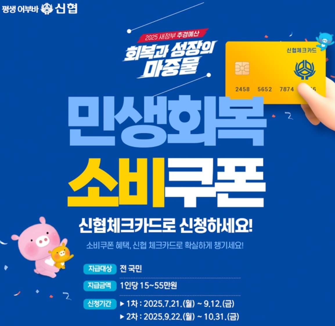 25년 7월 21일부터 지급이 시작된 신협 민생지원금신청은 인터넷뱅킹과 신협on뱅킹을 통해서 신청할 수 있다. 신협 체크카드를 소지하고 있는 고객이라며 누구나 신협 민생지원금 신청이 가능하며 1차 지급기간인 9월 12일까지 언제든지 오프라인 창구와 온라인 신청 링크를 통해서 손쉽게 지원금을 신청할 수 있다.
