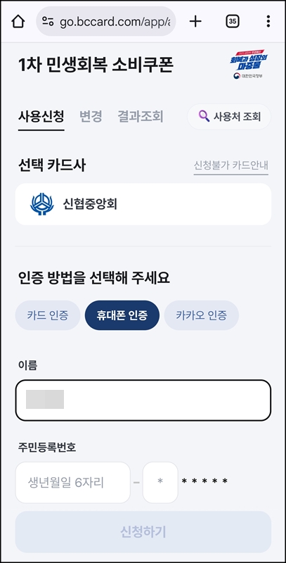 신협 민생지원금 신청을 할때는 선택 가능한 카드사가 신협중앙회로 고정되어 있으며 카드인증, 휴대폰인증, 카카오 인증 중에서 하나를 선택한 뒤 본인인증을 거치고 신청하기 버튼을 누르면 된다. 만약 온라인 신청이 어려워 은행 창구로 방문할 예정이라면 가까운 영업점에 신분증과 체크카드를 지참하고 방문하면 된다.