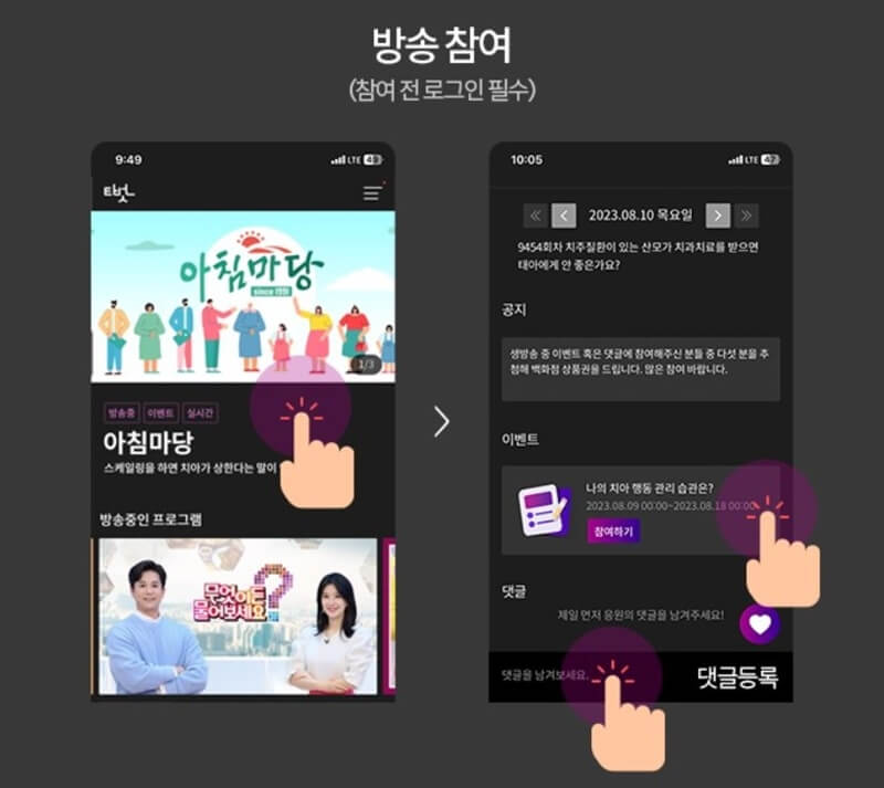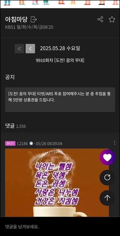 아침마당 돌발퀴즈 참여 앱인 티벗에서는 퀴즈 이벤트 참여뿐만 아니라 해당 방송에 대한 댓글 남기기도 가능하다.