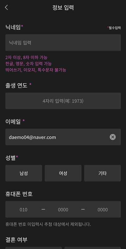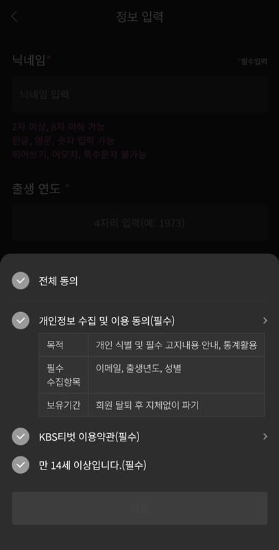 카카오 로그인을 연동했다면 이제 티벗 앱에 개인정보 수집 및 이용약관 등에 전체동의를 하고 정보 입력을 한 뒤 회원가입을 진행한다.