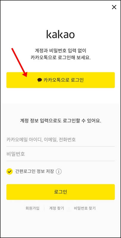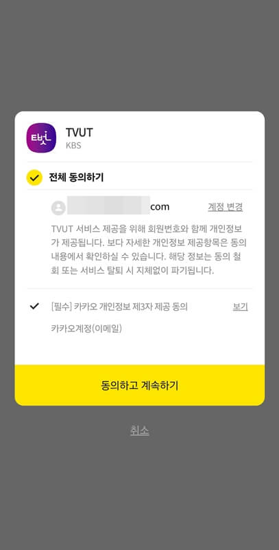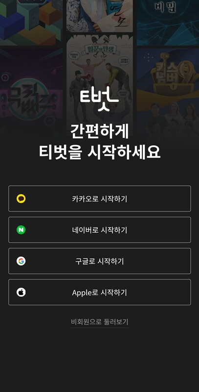 먼저 아침마당 돌발퀴즈에 참여할 수 있는 티벗 앱을 핸드폰에 설치하고 실행한 뒤 회원가입을 먼저 진행한다. 요즘은 거의 모든 사람이 카카오톡을 사용하고 있기 때문에 카카오로 시작하기 버튼을 누르고 카카오톡으로 로그인 > 동의하고 계속하기 순으로 진행하면 빠르게 진행할 수 있다.