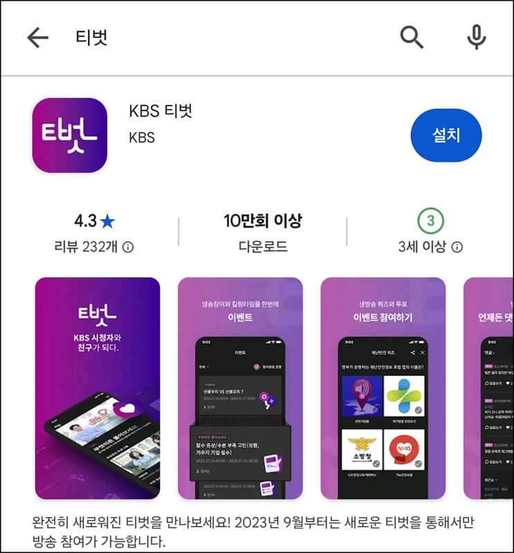 두 번째 아침마당 돌발퀴즈 참여방법은 티벗 앱을 통해서 참여하는 방법이다. 이 방식은 작년 9월부터 시행되었던 방식으로 핸드폰에 티벗 앱을 설치한 뒤 참여하면 된다.
