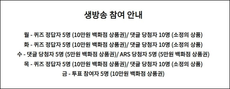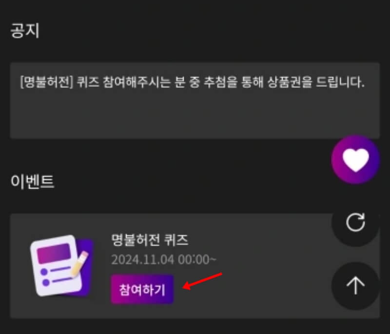 이렇게 생방송 중에는 이벤트 영역이 뜨면서 참여할 수 있는 퀴즈가 뜨니까 참여하기 버튼을 누르고 참여하면 된다.