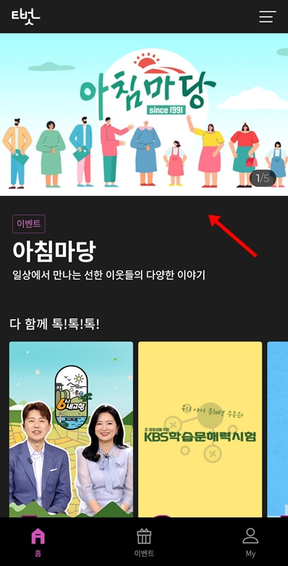 그럼 이제 아침마당 돌발퀴즈 및 다양한 퀴즈 이벤트에 참여가 가능하다. 단, 이 퀴즈 이벤트는 프로그램이 생방송으로 방송중일 때 진행되니까 아침마당을 하다가 갑자기 돌발퀴즈가 나오면 앱을 실행시키고 참여하면 된다.