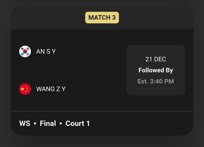 안세영 선수의 결승전은 한국 시간으로 12월 21일 일요일 오후 4시 40분에 시작된다. 대진표에 따라 안세영 선수는 1번 코트의 세 번째 경기에 배정되었으며, 상대는 중국의 왕즈이 선수이다. 조별리그에서도 이미 한 차례 맞붙어 승리를 거뒀던 만큼, 이번 준결승에서도 안세영 선수의 우위가 점쳐진다. 하지만 단판 승부인 토너먼트의 특성상 야마구치의 거센 반격이 예상되므로, 경기 시작 시간인 10시 30분에 맞춰 중계 채널을 미리 확인하는 것이 좋을것 같다.