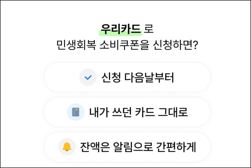 우리카드로 민생회복지원금 신청을 하면 다른 체크 및 신용카드와 마찬가지로 신청 다음날부터 소비쿠폰 사용이 가능하다. 무엇보다 내가 쓰던 카드 그대로 실적 혜택을 받으면서 사용할 수 있고, 사용 후 남은 잔액은 알림으로 간편하게 받아볼 수 있다.