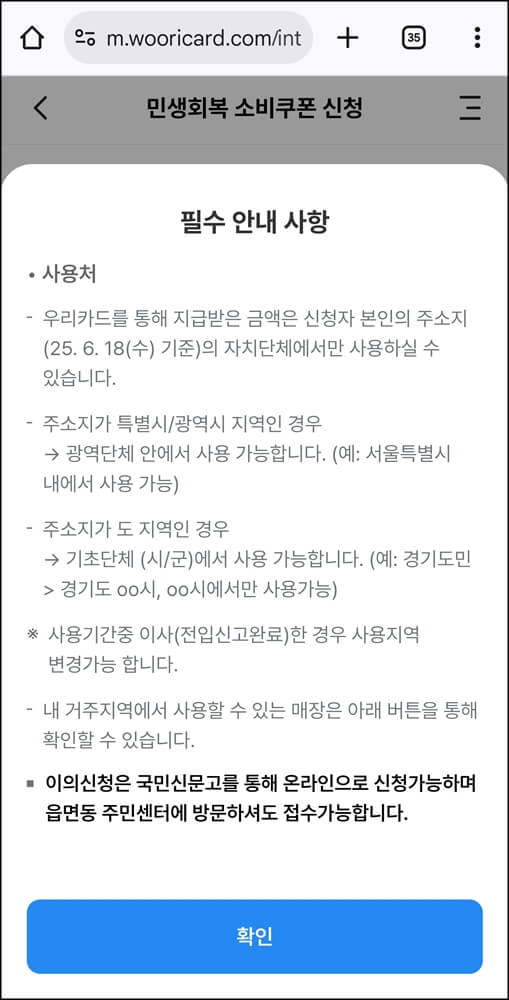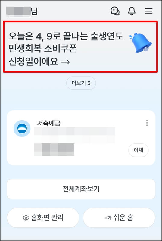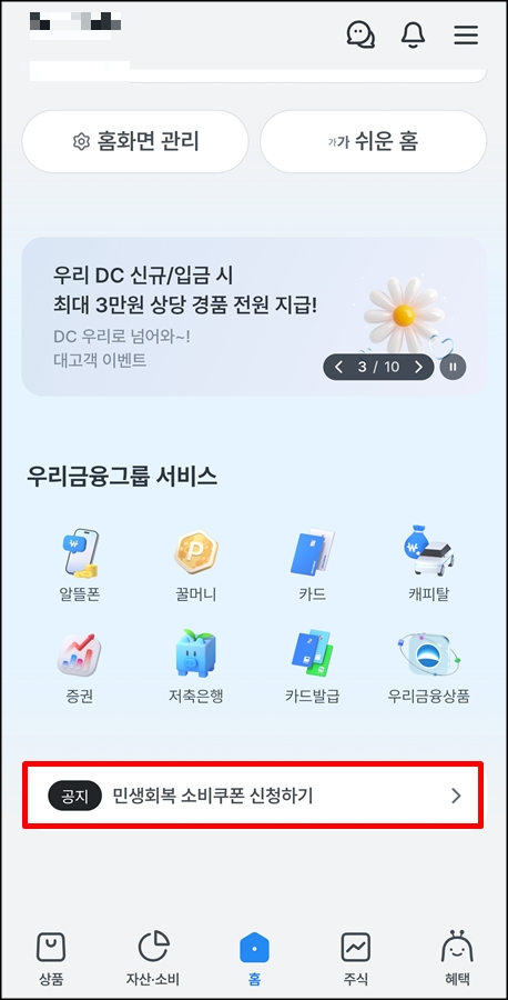먼저 필자는 오늘이 민생지원금 신청이 가능한 날이어서 우리은행 앱에 접속했더니 위와 같이 소비쿠폰 알림창이 떠있었다.