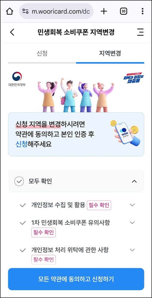 우리은행 = 우리카드에서는 신청을 할 수 있는 것뿐만 아니라 지역변경도 가능한데 지역변경은 이사로 주소지가 변경되었을 때 지역변경도 가능하며 민생회복지원금 신청 시 본인인증을 한번 거친 뒤 신청하면 완료된다.