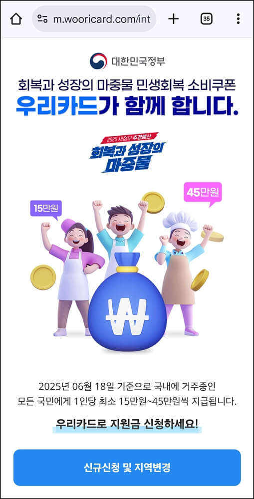 다음 단계로 넘어가면 민생지원금에 대한 정보를 확인할수 있고, 다시 한번 아래에 있는 신규 신청 및 지역변경을 클릭하고 본격적인 우리은행 민생회복지원금 신청을 시작하면 된다.