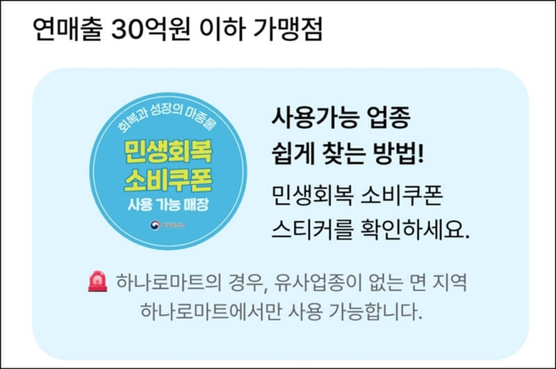 우리은행 민생회복지원금 신청 후 사용할수 있는 곳은 연매출 30억 이하 가맹점인데 민생회복 소비쿠폰 스티커가 붙어있는 매장이라면 어디든 사용이 가능하며 유사업종이 없는 면 지역 하나로마트에서도 사용이 가능하니 참고하자.