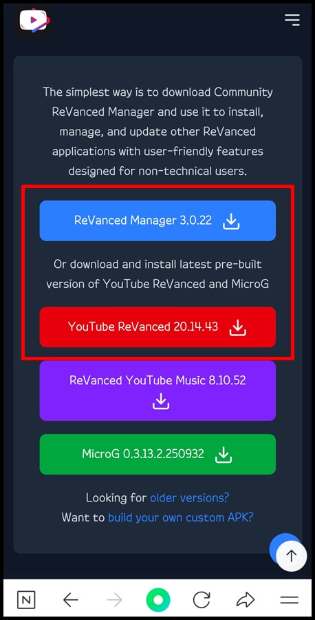 오늘 날짜인 26년 2월 21일 기준으로 유튜브 리밴스드 최신버전은 20.14.43이고, 리밴스드 매니저는 3.0.22가 가장 최신 버전입니다. 아예 처음부터 유튜브 리밴스드 설치를 하는 분들은 파란색 버튼인 ReVanced Manager 3.0.22를 클릭 하고, RV 매니저로 이동되면 빨간색의 다운로드 버튼 > ReVanced Manager 3.0.22 버튼을 한번 더 클릭합니다. (다운로드 버튼을 누를때마다 광고페이지로 이동되니 뒤로 가기 또는 X를 눌로 광고를 끄고 제가 표기해 둔 순서로만 클릭해서 진행하시기 바랍니다.)