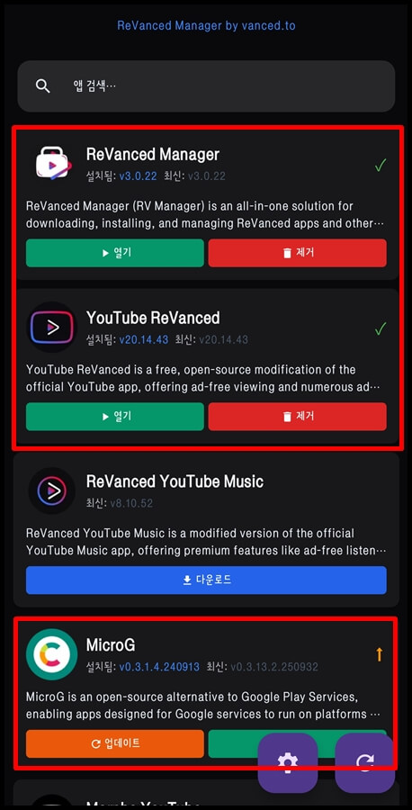 그럼 조금전에 설치한 리밴스드 매니저가 실행되고 이곳에서 우리가 평소에 사용할 유튜브 리밴스드 최신버전과 설치한 리밴스드가 잘 실행되게끔 도와주는 MicroG 파일도 설치해줘야 하는데요~ 저는 이미 설치가 되어있어서 열기 또는 업데이트 버튼으로 되어있는데 처음 이신 분들은 MicroG를 먼저 다운로드하고 YouTube ReVanced를 다운로드하면 됩니다.