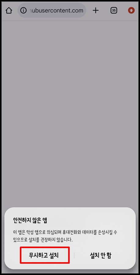 앞서 얘기했듯이 유튜브 리밴스드 최신버전은 비공식 어플이기 때문에 유튜브 리밴스드 설치하는 과정에서 경고 팝업이 자주 뜰 텐데요~ 여기서 무시하고 다운로드 또는 무시하고 설치를 누르고 진행한 뒤 설치가 완료되면 열기 버튼을 클릭하면 됩니다.