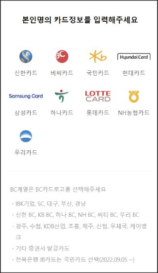 만약 결제계좌 등록이 아닌 인터파크 티켓 카드 등록으로 진행할 때는 신한, 비씨, 국민, 현대, 삼성, 하나, 롯데, NH농협, 우리 카드만 등록이 가능하고 BC 계열의 카드는 BC카드 로고를 선택하고 등록하면 된다.