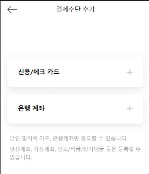 이후 결제수단 관리를 클릭하고 결제수단 추가(+) 부분을 클릭한 뒤 신용 및 체크카드 또는 은행계좌 중 하나를 선택한다. 어떤 공연이냐에 따라서 무통장계좌로만 결제가 가능한 티켓이 있고, 카드 결제만 가능한 공연이 있기 때문에 둘 다 미리 등록해 놓으면 편리하다. (단, PC방에서 진행할 경우에는 등록 후 꼭! 삭제하는 것도 잊지 말자.)