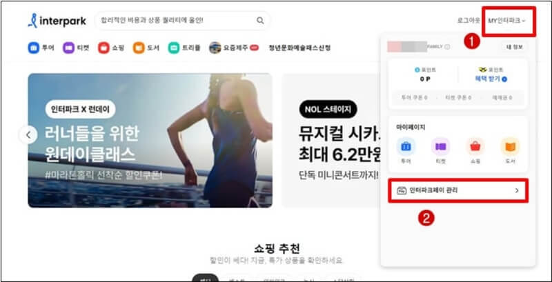 앞서 말했듯이 공연 티켓팅은 모바일보다 PC환경인 웹사이트에서 진행하는것이 좋다. 그래서 인터파크 웹사이트 홈페이지에 접속하여 로그인한 뒤 메인 오른쪽 위에 있는 MY 인터파크 > 인터파크 페이 관리 순으로 접속한다.