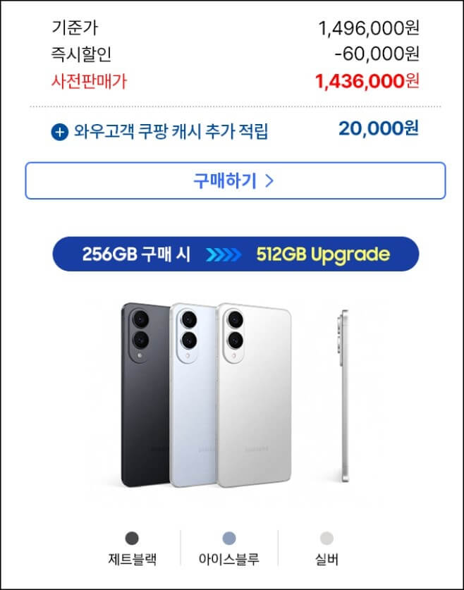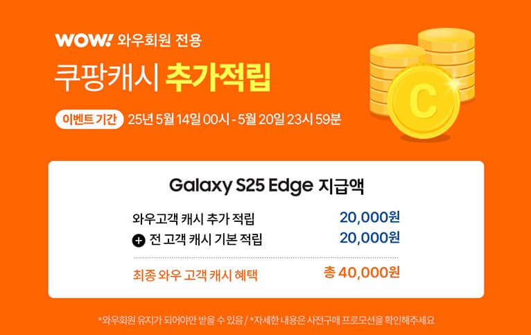그리고 앞서 얘기했듯이 쿠팡 갤럭시 s25 엣지 사전예약 기간 동안 해당상품 구입 시 와우고객 캐시 2만 원 추가 적립과 전고객 캐시 2만 원 기본적립으로 총 4만 원의 캐시 혜택도 받을 수 있다.