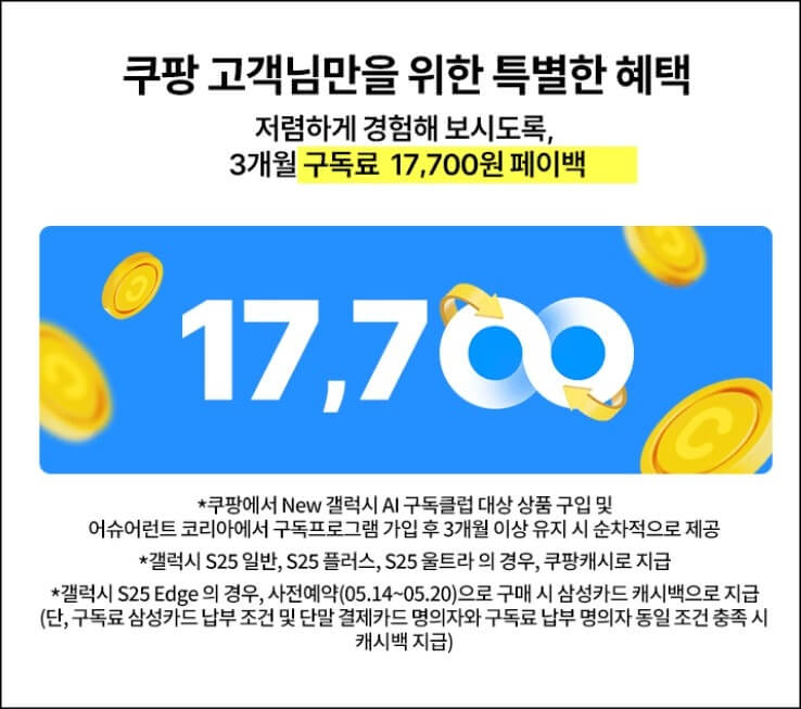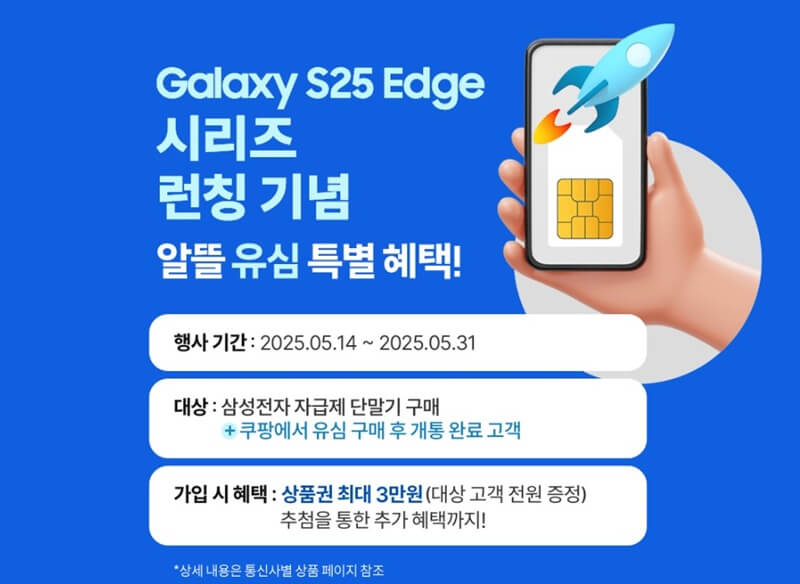쿠팡에서는 갤럭시 s25 엣지 론칭기념으로 쿠팡에서 유심 구매 후 개통을 완료한 고객들에게 알뜰유심 특별 혜택인 상품권 최대 3만 원 혜택까지 추가로 제공하며 New 갤럭시 AI 구독클럽 3개월 구독료 17,700원을 추가 제공한다.