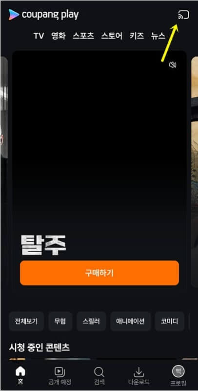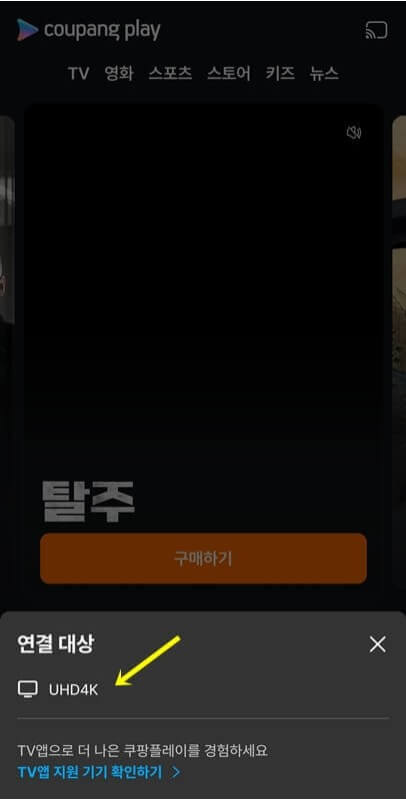 위에서 알려준 대로 쿠팡 플레이 tv 연결을 해도 되지만 앱을 설치하고 이런 과정이 귀찮다면 스마트기기에서 쿠팡 플레이 앱을 실행하고 상단에 오른쪽에 있는 미러링 아이콘을 클릭한 뒤 연결 대상 목록에서 우리 집 tv를 선택하여 쿠팡 플레이 tv 연결을 해도 된다. (물론 이렇게 연결해도 핸드폰 사용 가능함)