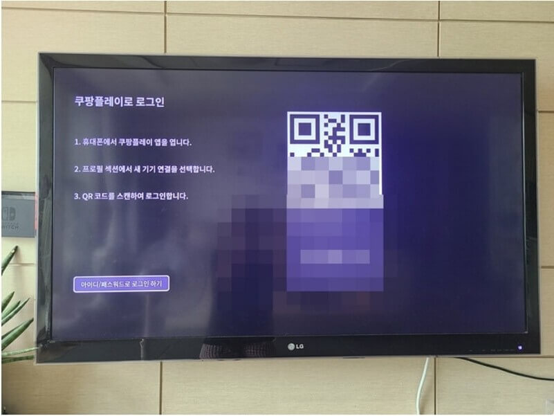 6. 그럼 위와 같이 QR코드와 코드 번호가 생성되는 화면이 나타난다. 이 화면을 그대로 띄운 다음 핸드폰에서 쿠팡 플레이 앱을 실행해 준다. (왼쪽 하단에 있는 아이디/패스워드 로그인하기를 클릭하여 쿠팡 아이디와 비밀번호로 로그인해도 됨)
