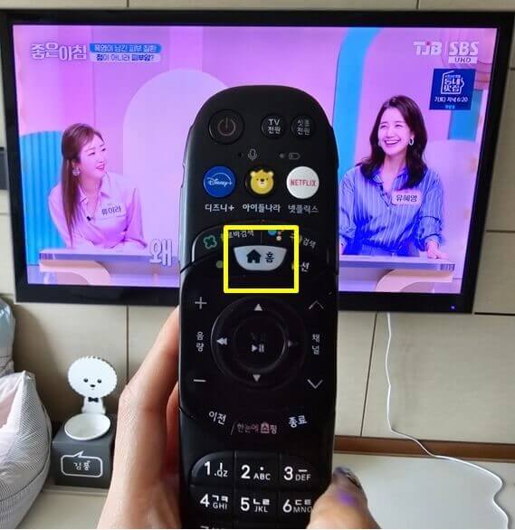1. Tv를 켜고 리모컨에 있는 홈 버튼 또는 메뉴 버튼을 눌러준다.
