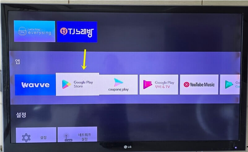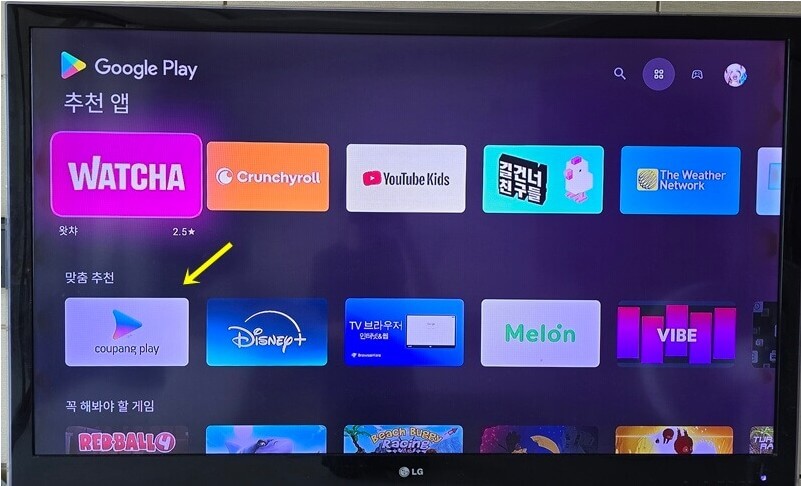 4. 그럼 해당 스마트 tv의 메뉴로 접속이 되는데 앱 부분에서 쿠팡 플레이가 노출되면 그걸 클릭하면 되고, 그렇지 않을 경우에는 구글 플레이 스토어로 접속하여 쿠플을 찾거나 검색창에 쿠플을 검색하여 해당 앱을 tv에 설치해 준다.