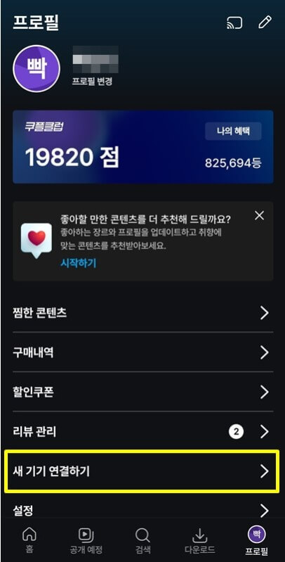 7. 쿠팡 플레이 앱에서 오른쪽 밑에 있는 프로필 > 새기기 연결하기 순으로 들어가서 아까 tv 화면에 떴던 QR코드를 스캔하거나 코드를 직접 입력하면 쿠팡 플레이 tv 연결은 끝났다.