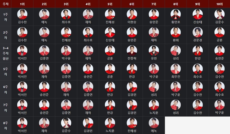 현역가왕2 투표하기 8주차 결과를 보면 1,2주차를 뺀 나머지는 모두 박서진이 1위를 차지했다. 박서진은 미스터리 현역으로 중간에 합류했는데 중간에 합류한 시점부터 계속해서 줄곧 1위를 차지하고있다.