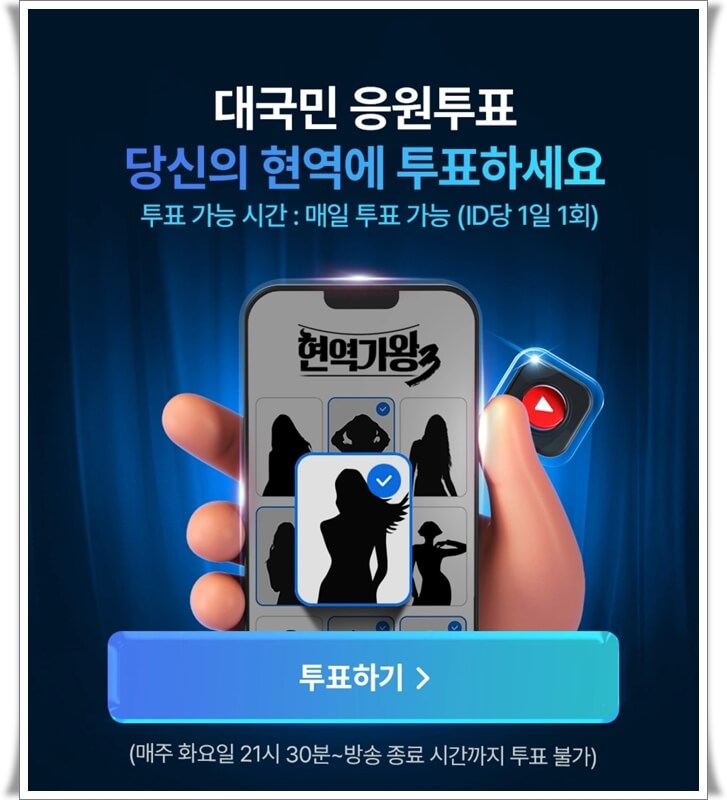 현역가왕3 국민투표는 공식 모바일 앱을 통해 간편하게 참여할 수 있습니다. 투표는 ID당 1일 1회만 가능하므로 매일 잊지 않고 접속하여 소중한 한 표를 행사하는 것이 중요합니다. 투표권은 매일 자정을 기준으로 갱신되며 누구나 제한 없이 참여하여 자신이 지지하는 가수를 응원합니다. 다만 방송이 진행되는 매주 화요일 밤 9시 30분부터 방송 종료 시간까지는 투표가 일시 중단된다는 점을 유의해야 합니다.